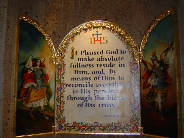 This second triptych (also in the Reconciliation area) shows a quote from Colossians. The doors of this painting show two of the archangels, Gabriel on the left and Michael on the right. Father chose the font, the color and the border around the words. Same dimensions as the other painting