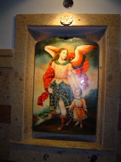 Father requested an exact replica of this painting from a 16th century church in upper Peru. Approximately 36 x 24 inches, oil on wood. (located just outside the chapel).