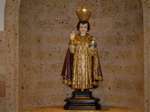 42" tall, wood with 24K gold plated .925 silver, hand-carved and crafted in Bolivia. This piece was created by combining parts of three other images. Father selected the crown of one statue, the orb of another and the body of a third. The image uses over 5 pounds of silver. All of the clothing is decorated in silver, which was then gold plated. The crown and orb are also gold and silver. (In the chapel area)