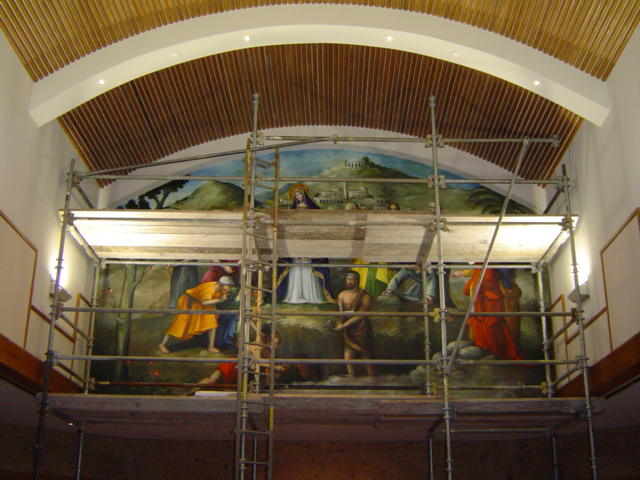 Master Peruvian artist, Jesús Cuba, painted a replica of Rembrandt's classic, The Prodigal Son in the form of a triptych on wood. At its height the painting is 48 inches tall. The width of the center section is 36 inches. In order to accommodate the triptych format, figures had to be moved and columns extended. The doors, when closed show intricate designs hand carved in the wood. (in the Reconciliation area)