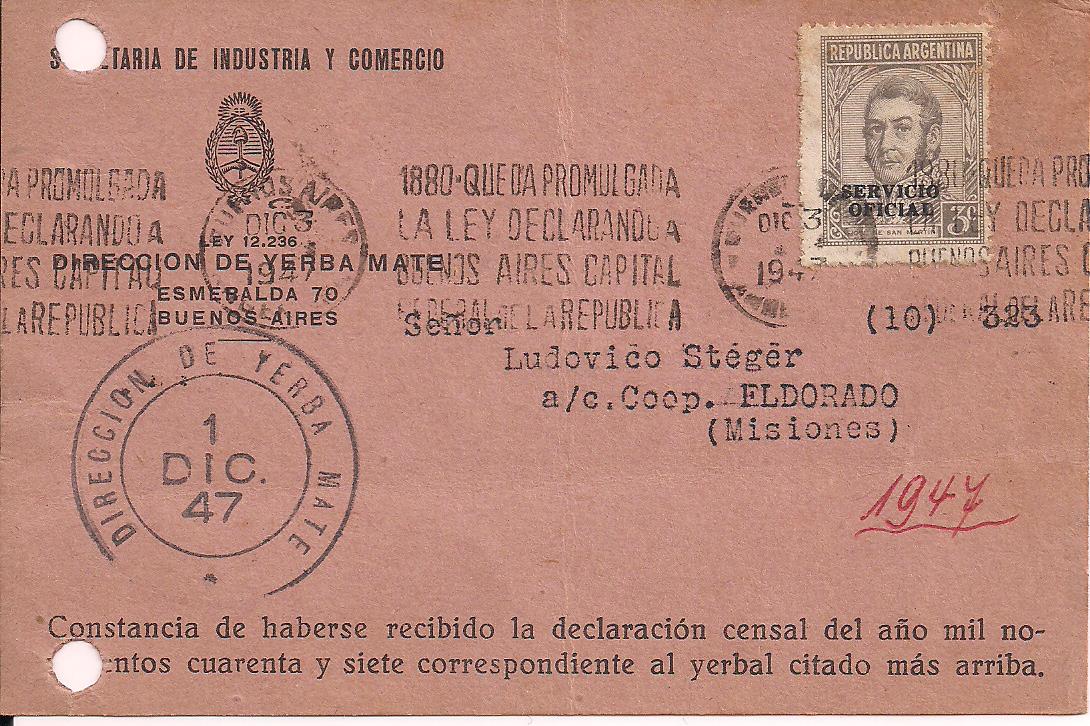 O54? on 1947census receipt Slogan Cancel commemorating Buenos Aires as capital since 1880 $10 PHOTO