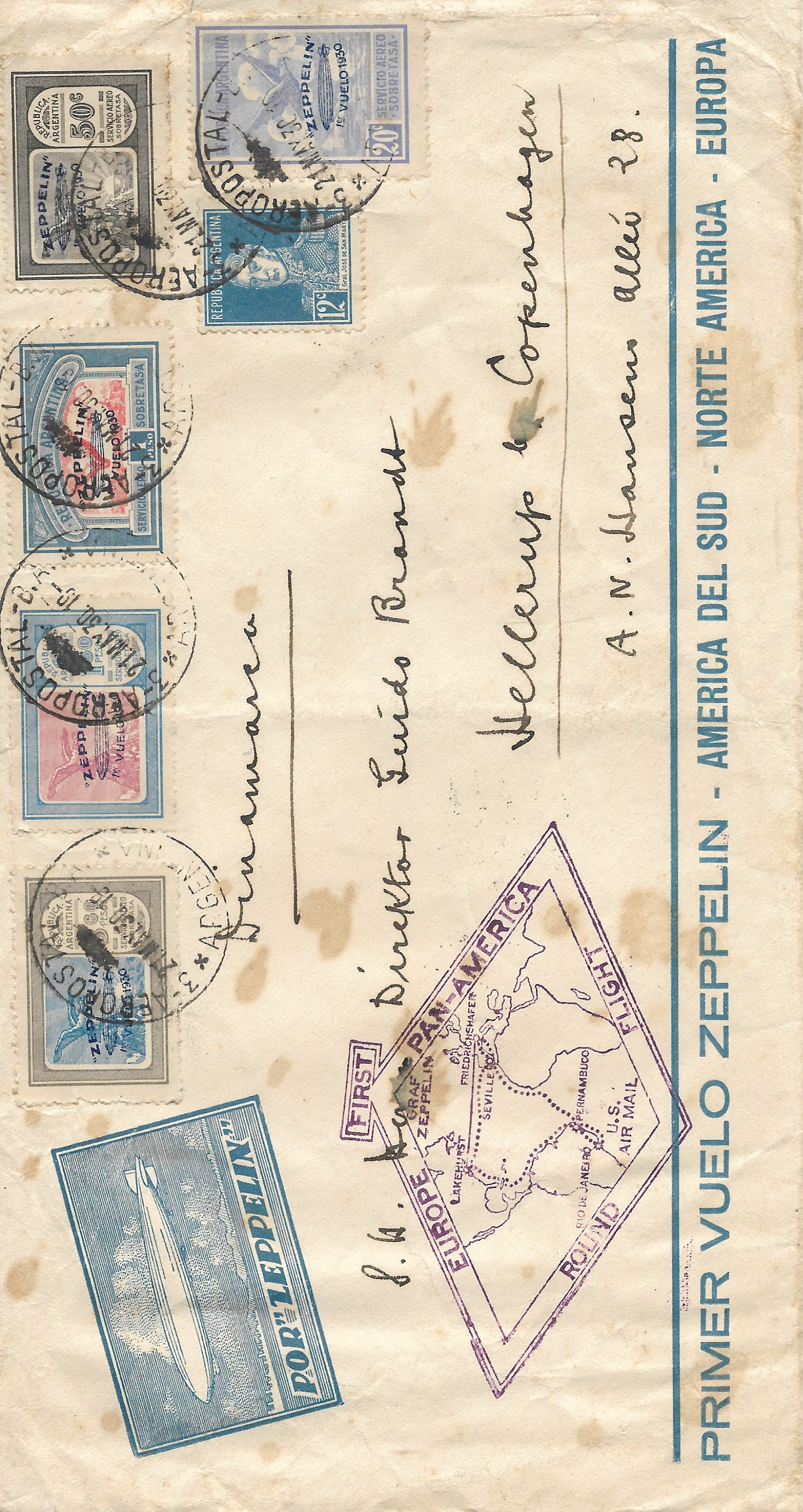 C20-4--complete set on fist round trip Zeppelin cover to Copenhagen, attractive blue "Por Zeppelin" printed cachet and purple hand stamped cachet of flight. Toning on cover detracts from the overall attractiveness, but the stamps are unaffected. June 6, 1930 Friedrickshaven receiving cancel on reverse.A great opportunity to own this scarce item at a very attractive price. $300 SCAN