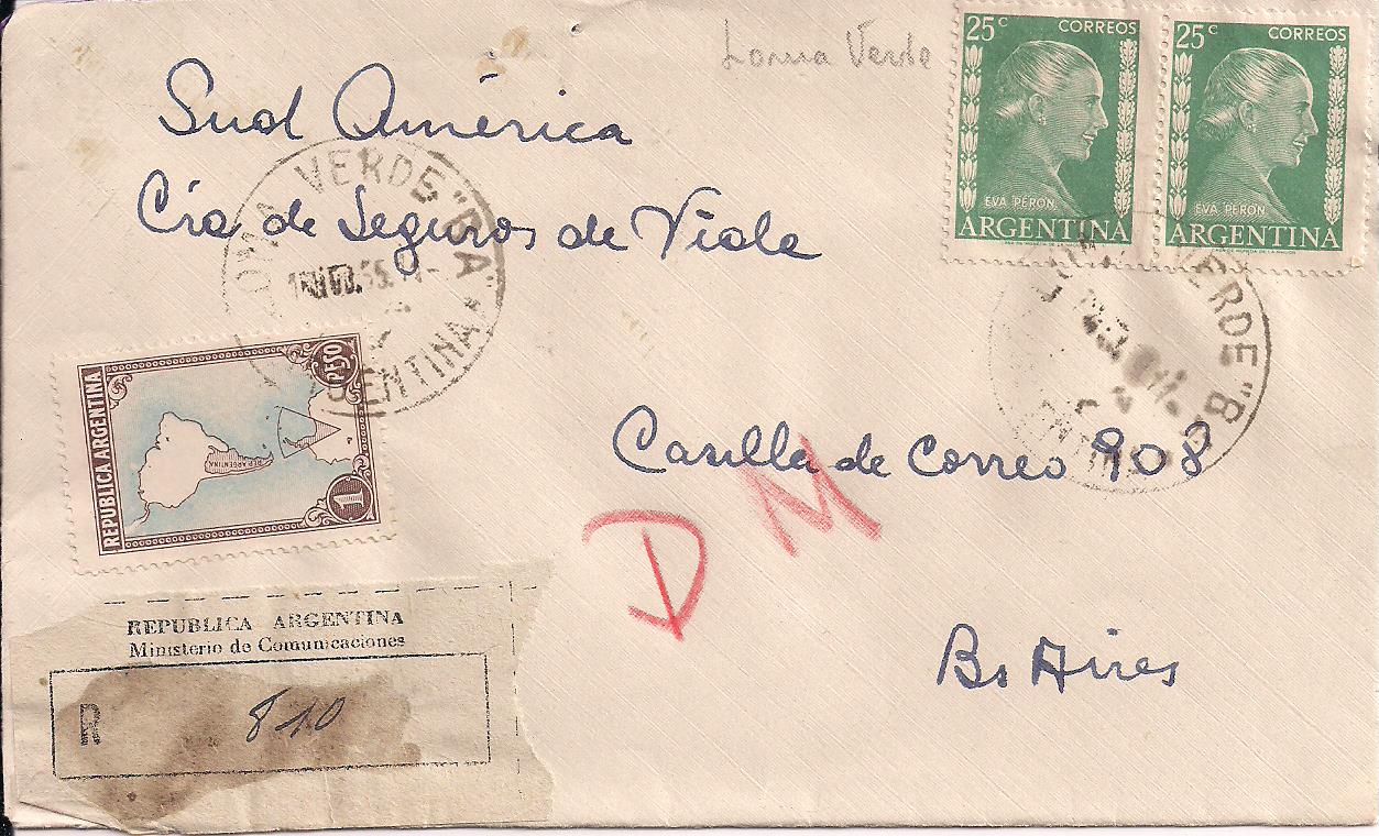603 pair Eva Peron and 594 on registered letter from tiny town of Loma Verde to Buenos Aires, $20 PHOTO