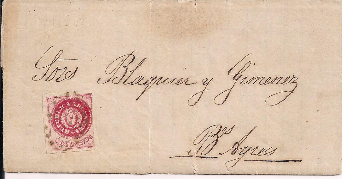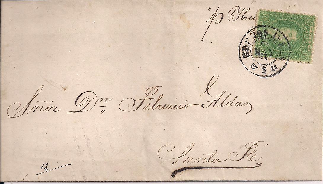 12 outer from Buenos Aires to Santa Fe, very attractive, well centered copy of 12 tied to cover by BUENOS AYRES circular date stamp (May--no year), very clean and attractive cover, scarce usage $350. PHOTO