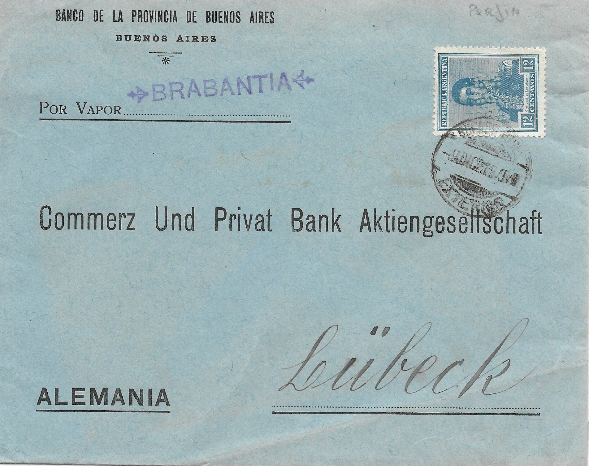 238 or 255 with BPB perfin (Banco de la Provincia de Buenos Aires) to Leubeck Germany, smudgy 1921 ccl $15 SCAN