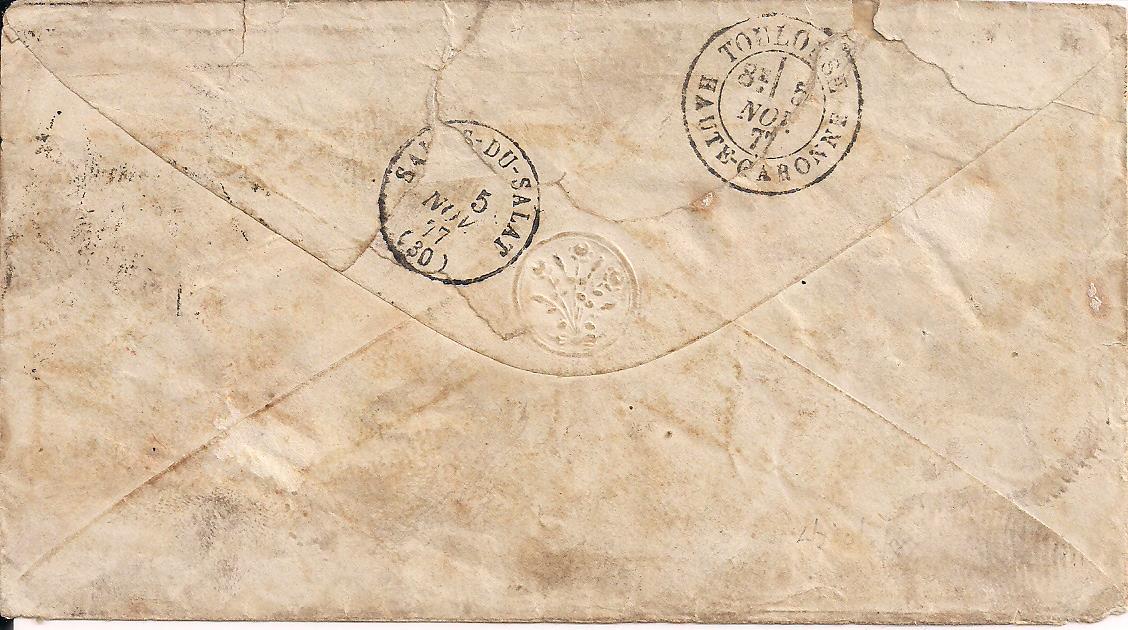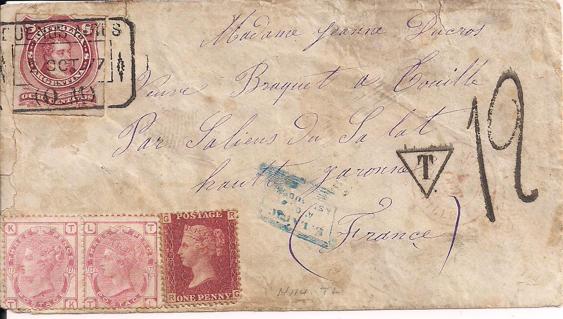34 on envelope to Salens du Salat France tied to cover by Oct 2, 1877 rectangular Buenos Aires datestamp. Dual franked with 3 British stamps (33a and a pair of 61) but not tied to envelope. Postage due inverted triangle T marking and 19 manuscript rate marking. Revers has Toulouse Transit marking and Saliens du Salat receiving mark. Soiled, but a very interesting piece. $150 PHOTO1 PHOTO2