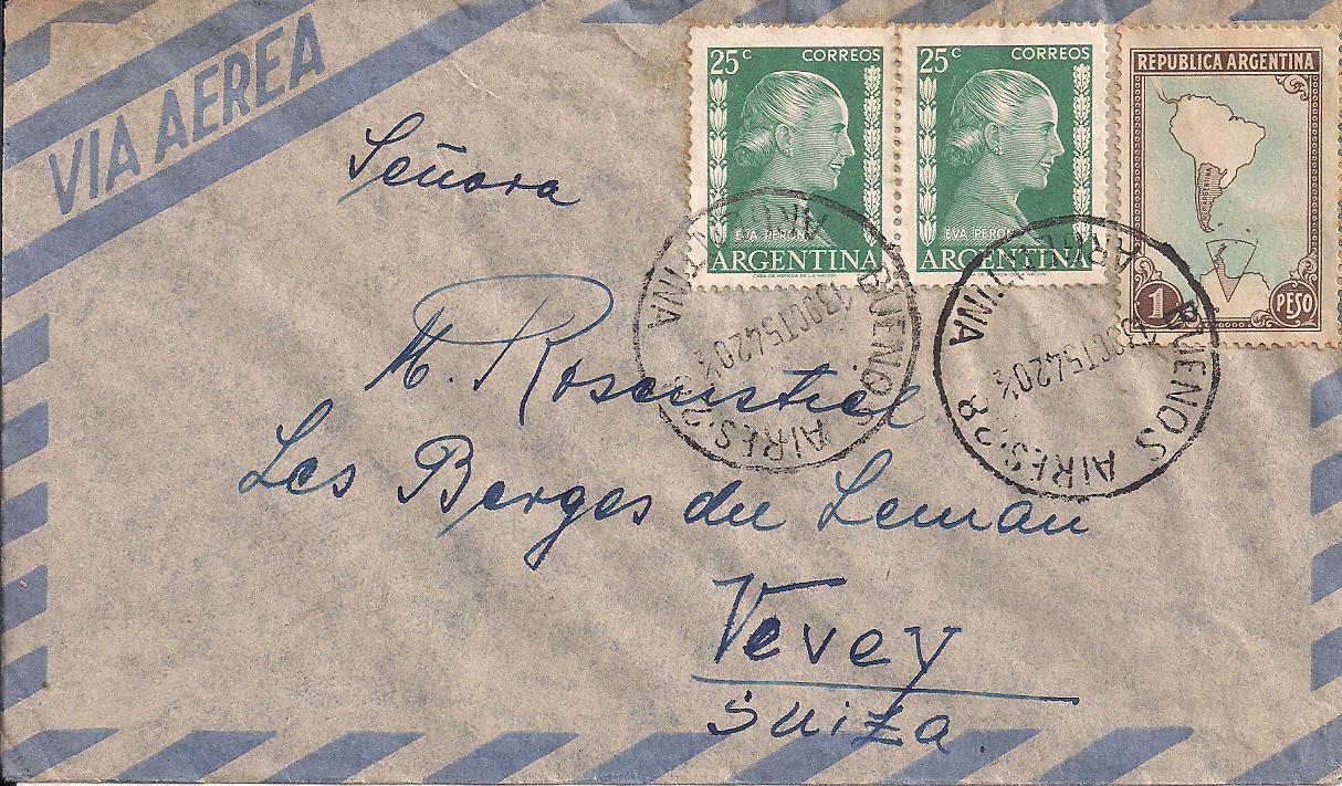 602 (2) and 594 on airmail letter from Buenos Aires to Vevey, Switzerland, $10 PHOTO