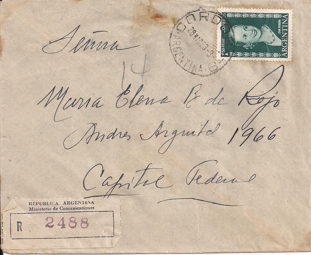 601, 602 (2), 603 (4), Eva Peron Registered letter from Buenos Aires to Santa Fe Province, unusual address "FCNGB" perhaps military, $10 PHOTO