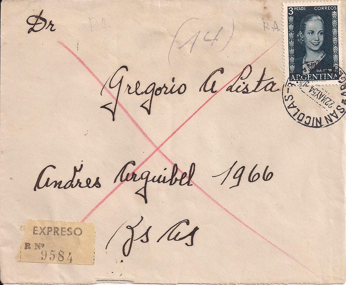614 on May 22, 1954 Special Delivery letter from San Nicolas to Buenos Aires, unusual franking $15 PHOTO