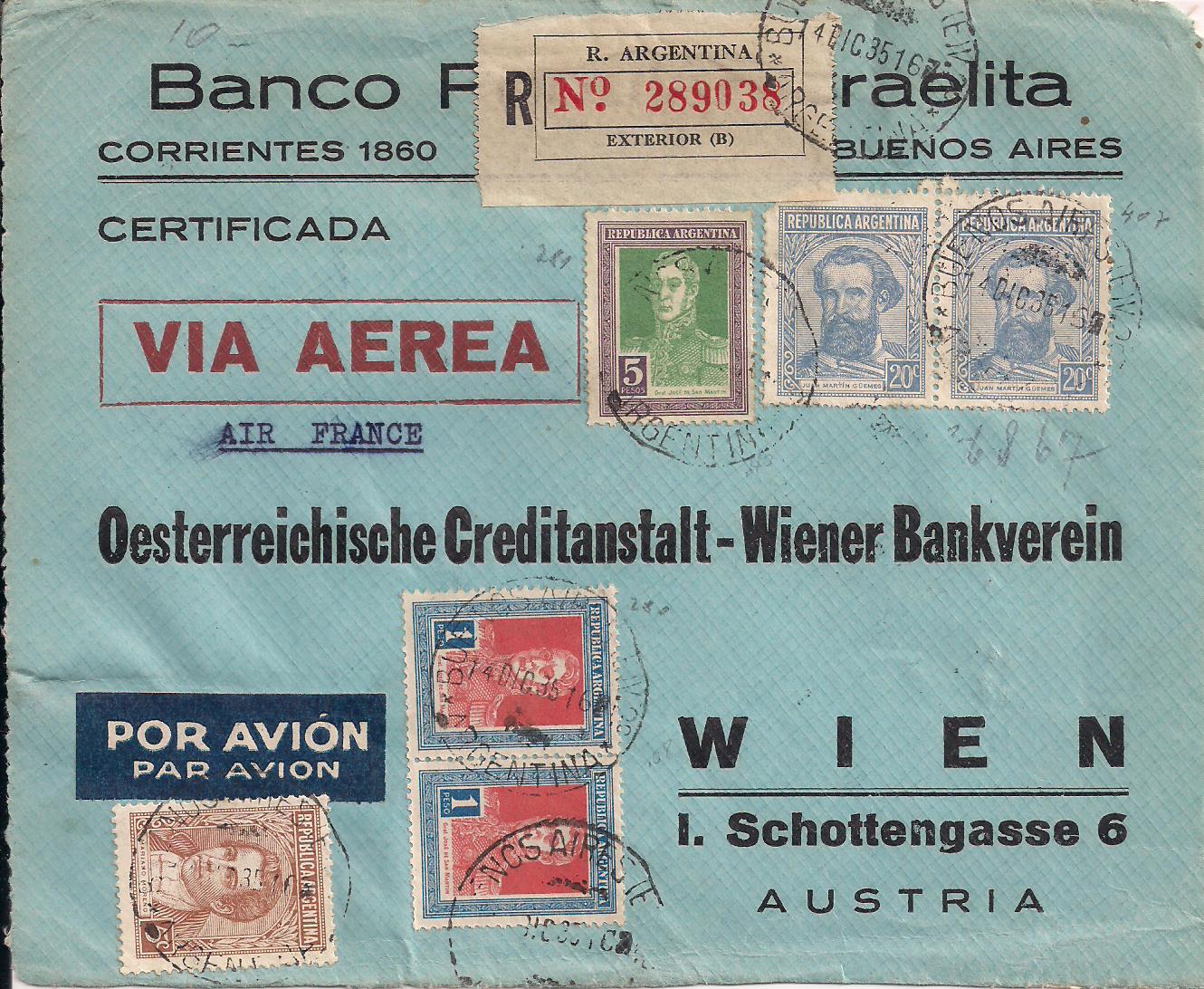 1935 Registered front from Buenos Aires to Vienna. Very attractive, the front appears to have been removed from a large parcel as the postage paid was $7.45., paid with 353 (2), 354, 427 and 427 (2). $25 PHOTO