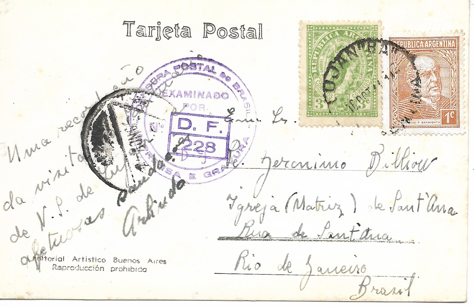 418, 519 on post card from Lujan, Buenos Aires to Brazil, Oct 16, 1944 iwht violet Brazilian censor marking, interesting, scarce marking $15 SCAN
