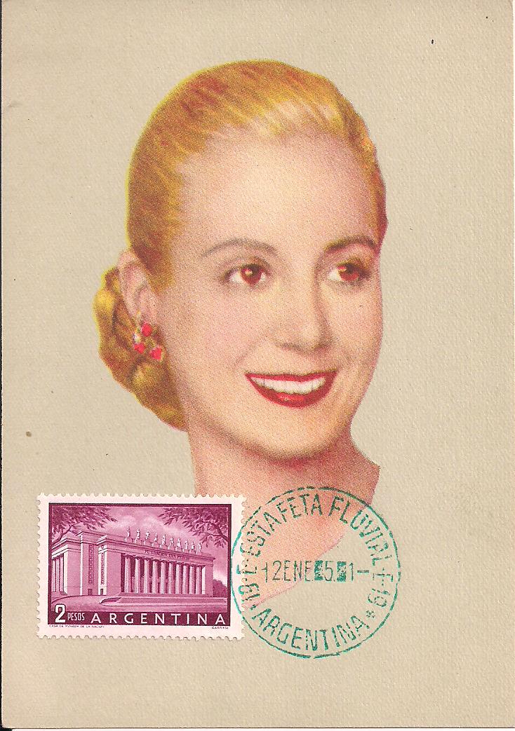 637 on unused picture postcard depicting Eva Peron, stamp is tied with Fluvial (water) post cancel, very pretty $10 PHOTO