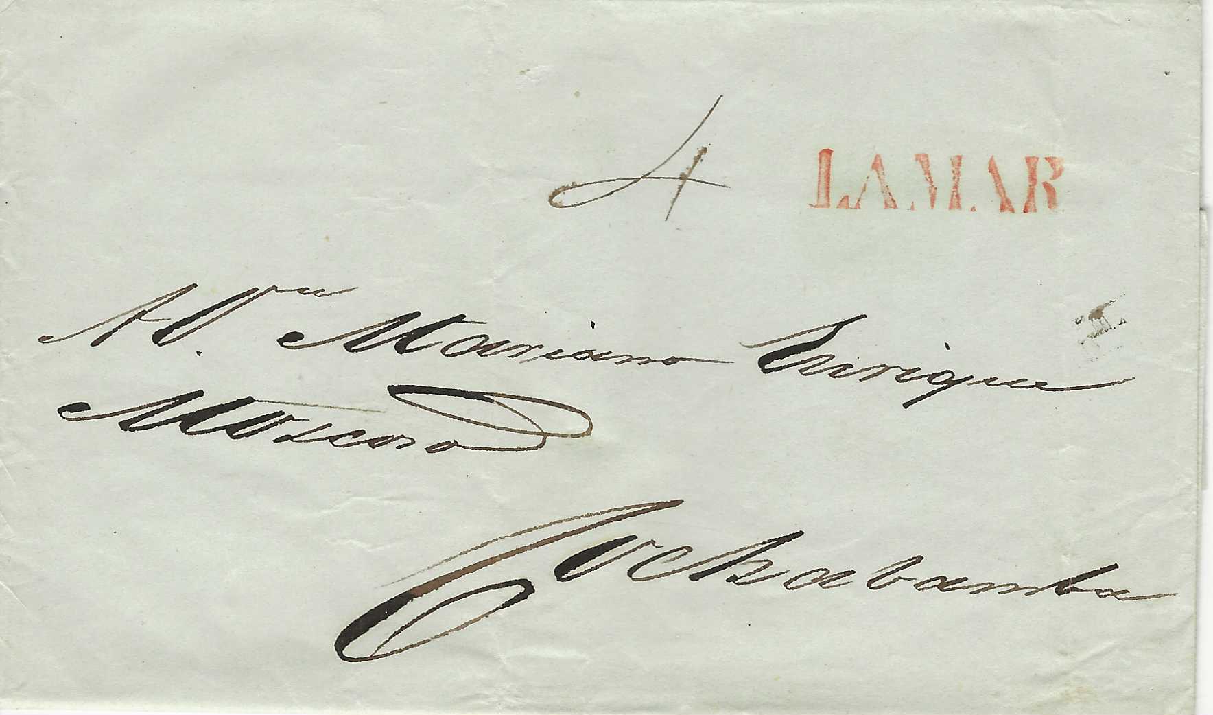 July 13, 1848 entire PAZ (LaPaz) straight line marking in red and manuscript 3 rate marking to Tacna $75 SCAN