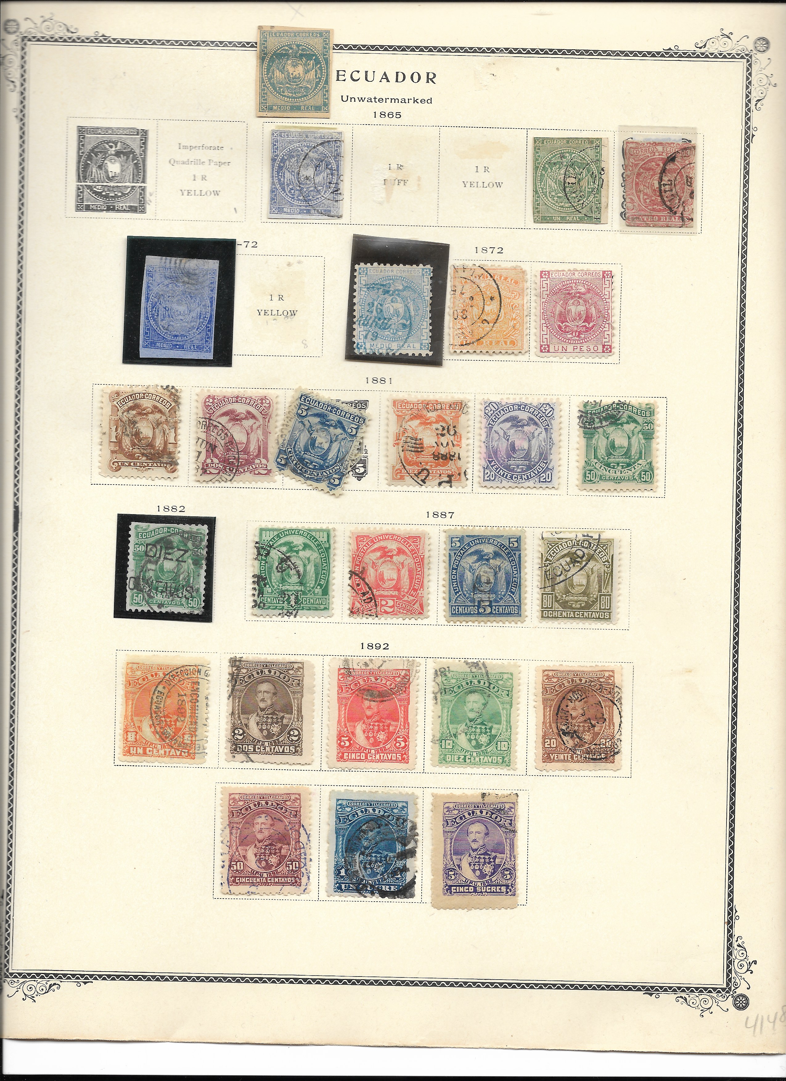 EC-B-73-09--1865-2003 Parallel M/U collection on Scott Specialty pages with a few overflow pages included that won't fit in the album. Loaded with useful material throughout, a very impressive accumulation of Ecuador. Better include M12-7, 19-22, 145-52, 174-80, 277, 366-72,C57-63; 417-22, 440-3, 444-6, 618-9, 751-C, C441-8; 753De P & I, 752Bc P & I, 754f,g P & I (4 SS); 758Ef P & I; 759Ef P & I; 763-763E, 763Ef Imp, 765-765E, 768F P & I, 870-5,C527-8, 867-80, 914-29,C554-8; 980-3, C663-78; 1006, 1162-70, 1173-7, 1199-202, 1281-6, 1309-14; 1358-60, 1380-1, 1382-3, 1387-91, 1401-4, 1424a, 1430-4, 1436-40, 1441-5, 1446-8, 1454-6, 1468-9, 1487a-b, 1667-9, C43-50, C54-6, C65-9, C114-23, C176-80, C431a, C440a, C630-1; C719-20, CO11, O92, O150, mixed 9-11, used 2, 19-22, 63-9, 174-80, 181-9, 304-16, 765-765E, O34-41, O92, RA10-4. Cat is $3998.30, net is just $1200.