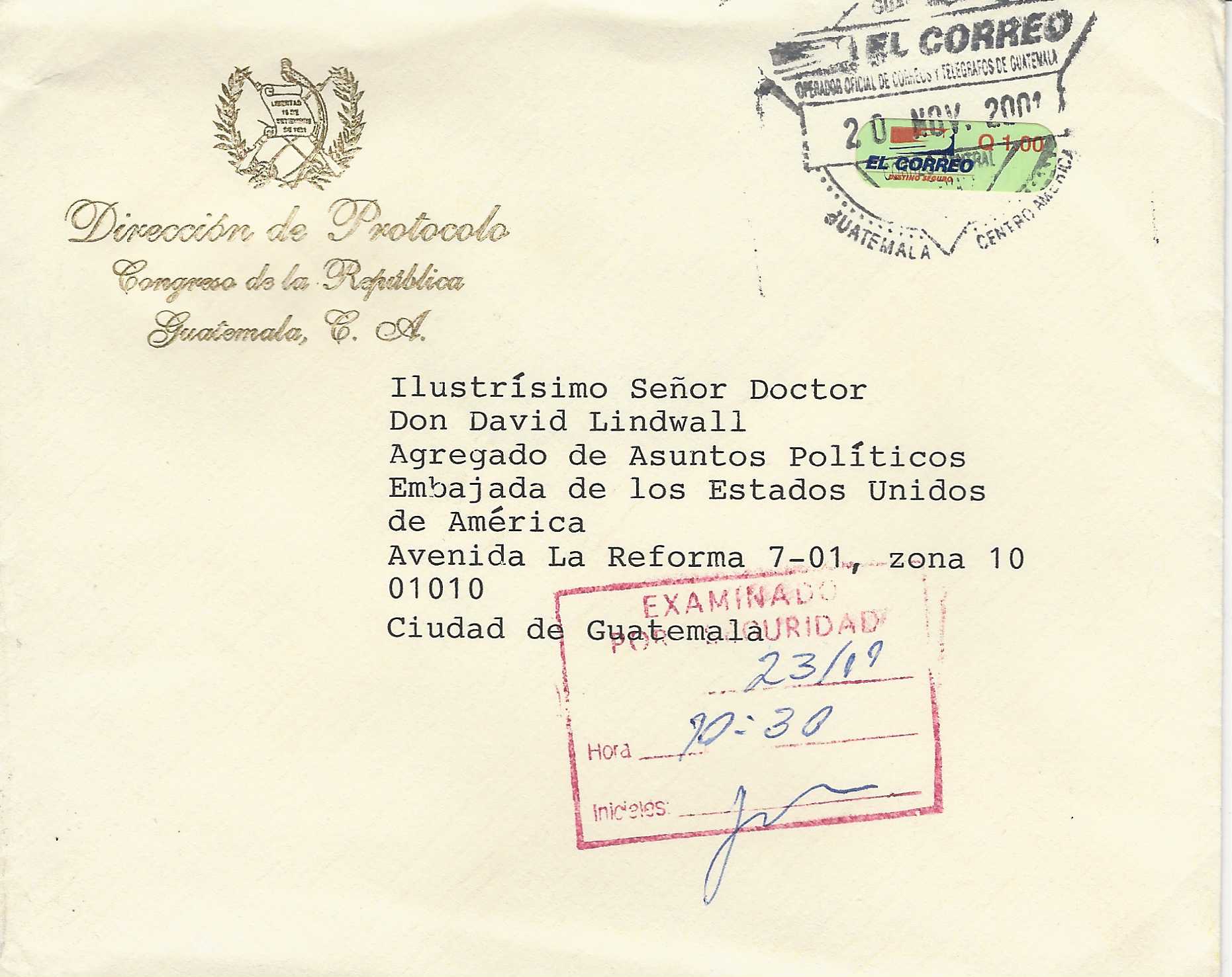 Unlisted Q1.00 self-adhesive stamp o a November 20, 2001 cover mailed locally in Guatemala City from the National Congress to a US diplomat. Very unusual. $50 SCAN