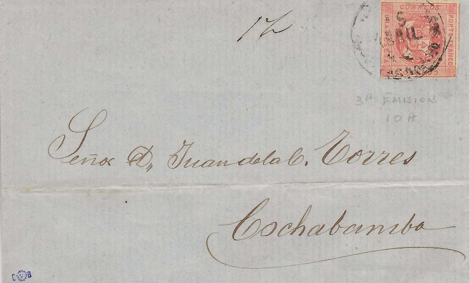 10 on November 19, 1862 otuer from Tacna to Cochabamba (Bolivia), third printing, margins close on 3 sides $125 SCAN