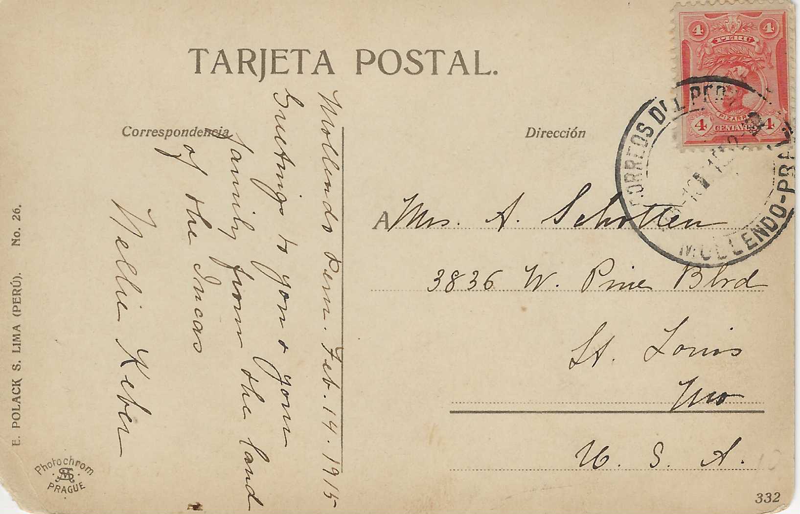 179 on postcard from Mollendo to St. Louis, reverse shows ruins of Sacsahuaman on the outskirts of Cuzco, one rounded corner, $10 SCAN