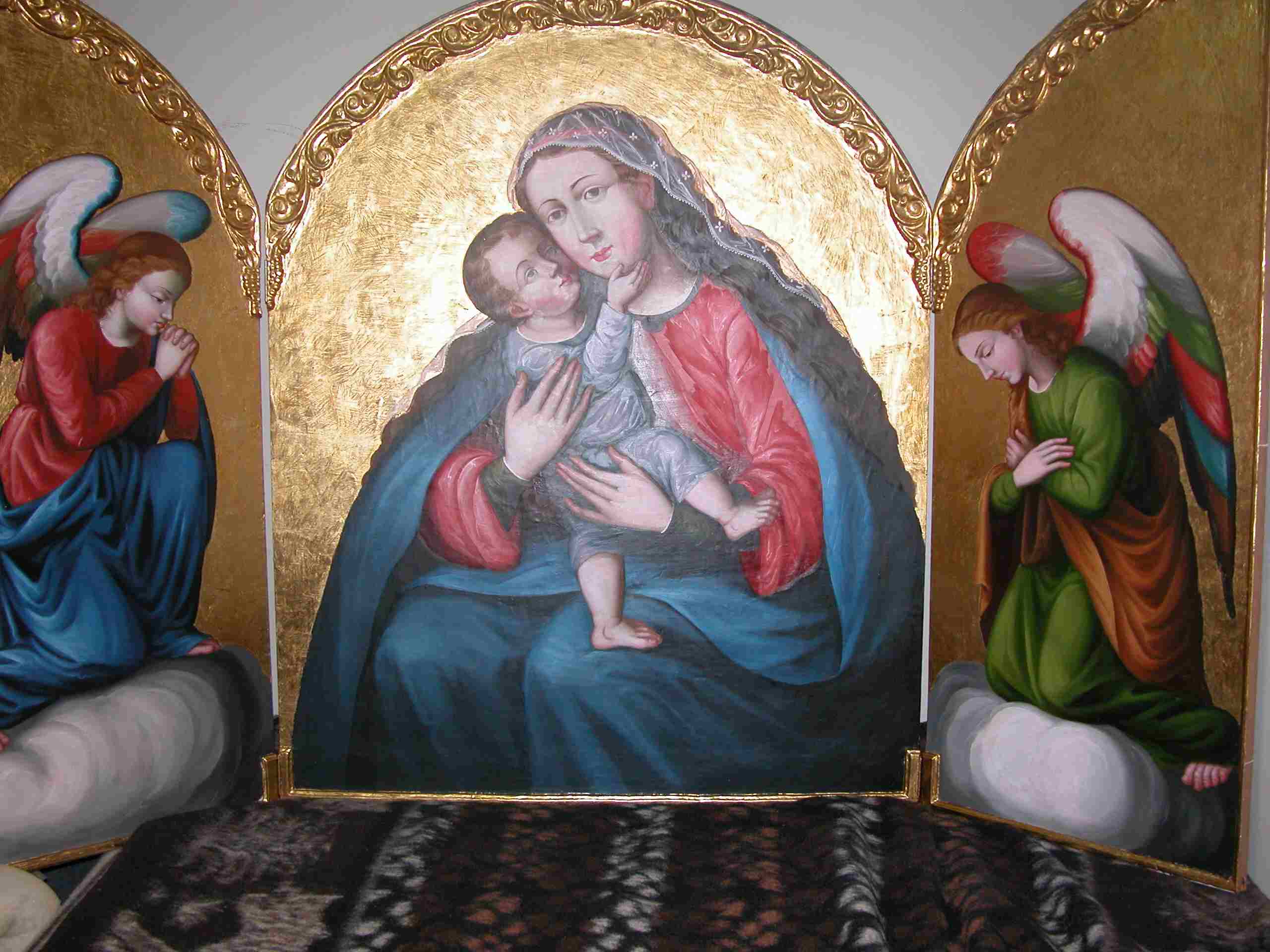 Oil and gold leaf on wood. A representative of Saint Francis of Assisi and I talked at the Form Reform Conference in California. She fell in love of a canvass I had of the Holy Family. She asked to have Joseph removed from the painting and the dark background replaced with gold leaf. Black and white images of the angels on the door were sent via e-mail and Peruvian master artist, Jesús Cuba, converted them into color images. The central figure is 5 feet (60 inches) tall by 4 feet (48 inches) wide. After the initial meeting, all of the details in the creation of this piece were completed by phone and e-mail.