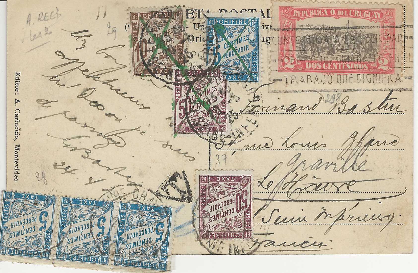 300 2c salmon postcard to France, 1925, card shows the Monument to Sarandi. Interesting undated slogan cancel on stamp, "Contribute to the happiness of the child, guiding him in the work that dignifies", postage due marking (T in triangle), paid with 7 French postage due stamps, including J28 (x4), J30, J38 (x2), tied with May 20, 1925 CDS. Very attractive and unusual $95 SCAN