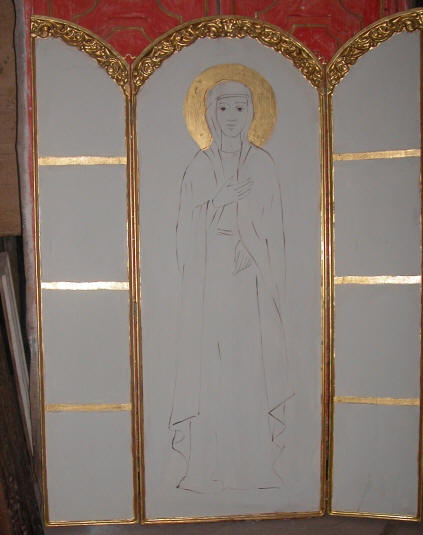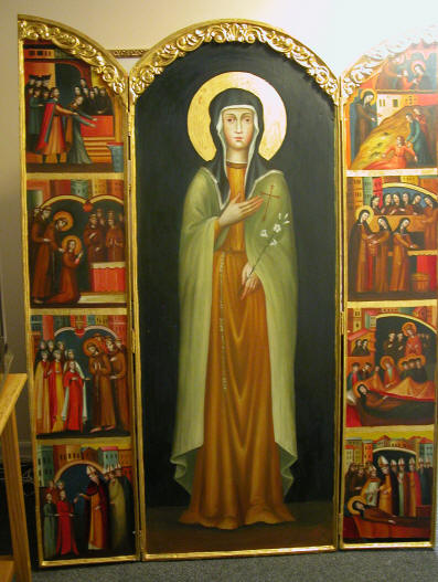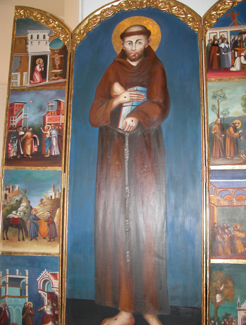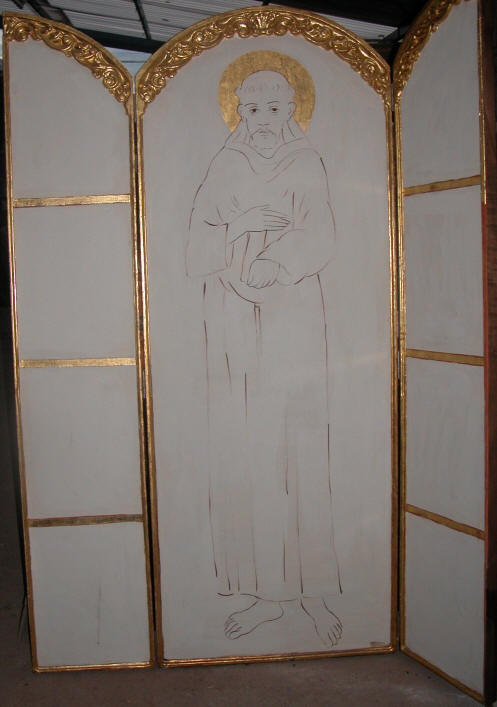 In 2007, we were contacted by St Francis Assisi parish in Bakersfield once again to complete some additional artwork for the parish's chapel area. The parish chose triptychs of St. Clare and St. Francis to be recreated as life sized paintings. The parish wanted the work to be completed on site, so the artist completed preliminary sketches in Peru on the wood and had these shipped to the parish. He then painted for 2 weeks in the actual church chapel to complete the paintings. Scroll down to see the triptychs as shipped and as completed. The final shot at the bottom of the page shows the ornate wood work on the doors of the triptych, only visible when the triptychs are closed. Click here or on any of the paintings below to see the completed works in the chapel.