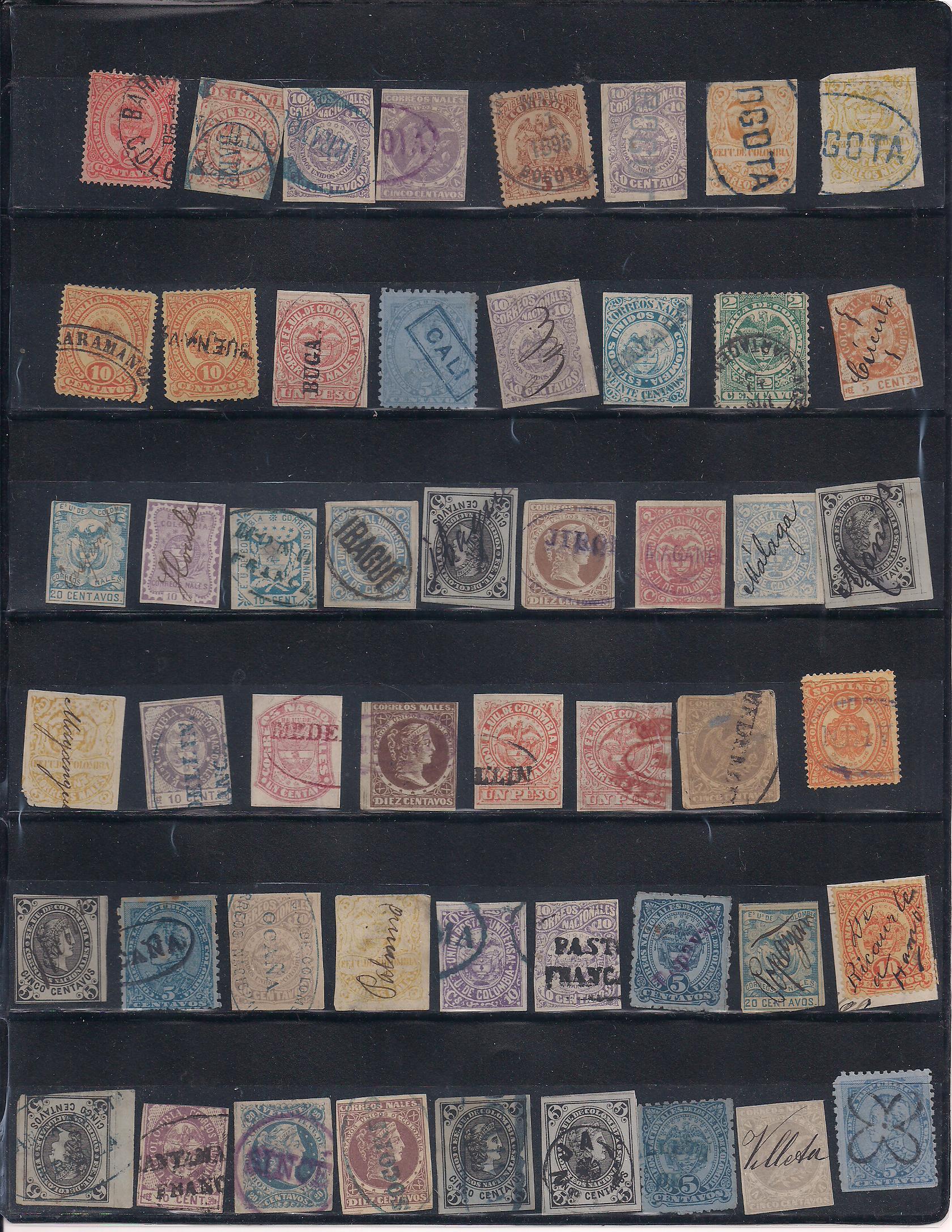 CO-11--Colombian Cancels--51 different types or colors including Buenaventura, Buga, Cartago, Cucuta, Espinal, Florida, Jiradot, Magangué, Málaga, Neiva, Ocaña, Pasto, Palmira, Panama, Popoyán, Ricuarte, Sincelejo, Socorro, Tocaima, Tunja and Villeta. PHOTO Net $125.