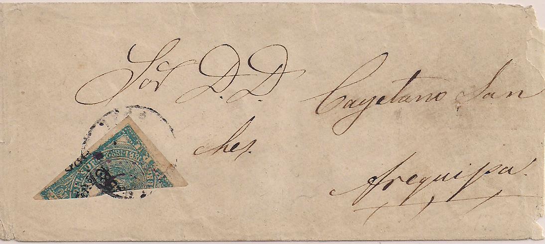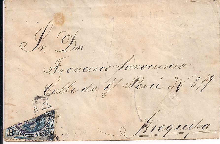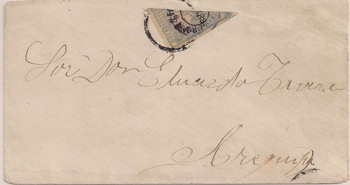 3N7 Bisect Puno to Arequipa paying the 5c 1/2 ounce letter rate to 2 towns on the same rail line. The 10c was the loest denomination available and bisect had to be used. Dated January 8, 1883. PHOTO $500