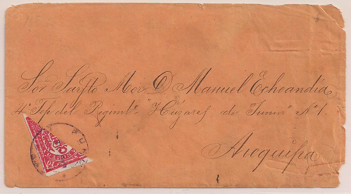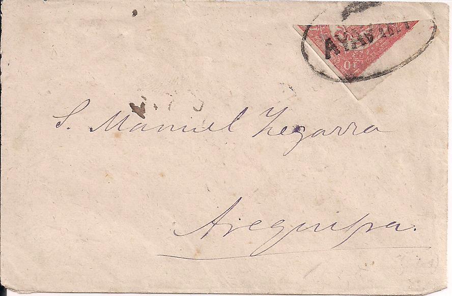 3N7 Bisect The small village of Ayaviri is located some 100 miles north of Puno and soon ran out of frankage materials and used the revenues available from Arequipa. This 10 centavo carmine has no overprint which indicates it was used in early 1883. It is address to Arequipa on the same rail line and thus, needed only 5 centavos, which is satisfied with the bisected 10 centavo. $ 600 PHOTO