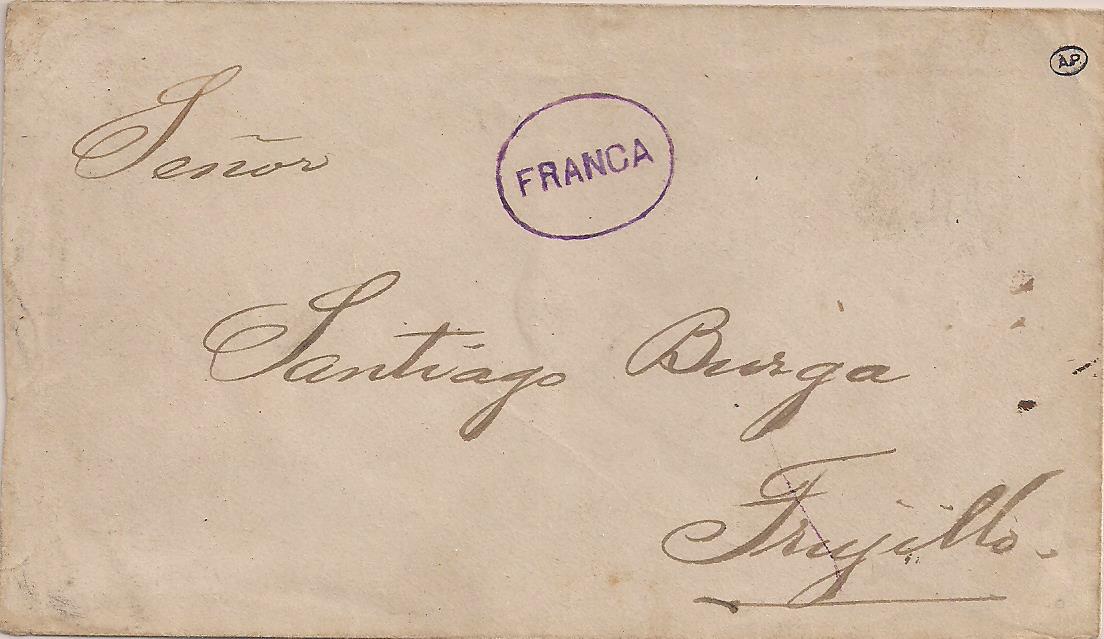 7N1 Type Stampless cover from Chiclayo to Trujillo with oval "FRANCA" handstamp in violet, used when no stamps were available. The small AP in the upper right hand corner is the expertising mark of Angel Puppo, the foremost Peruvian experct in philately of the War of the Pacific PHOTO $500