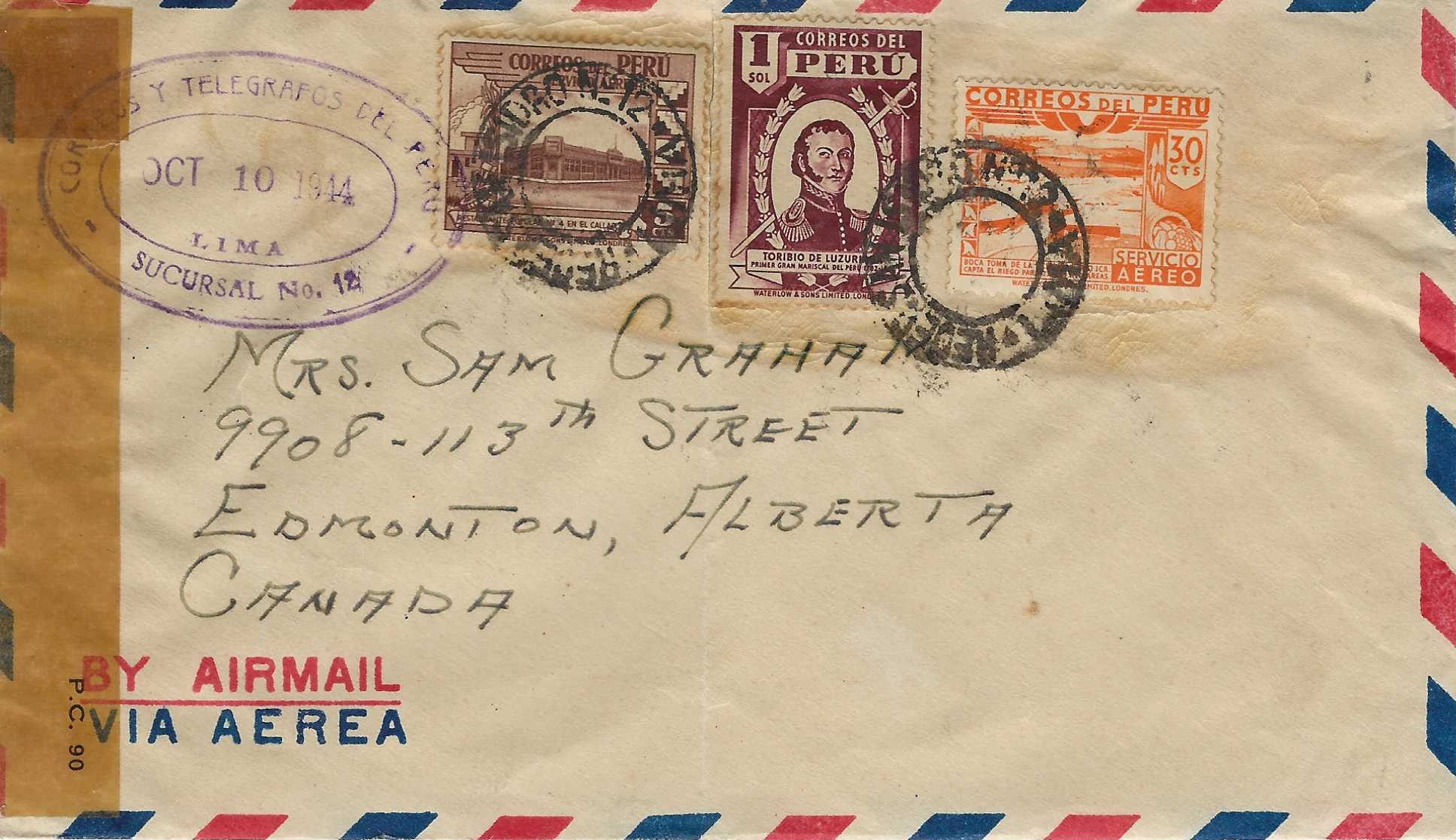 381, C49, C53 on Oct 10, 1944 cover from Lima to Edmonton, Alberta, Canada, tape censor on left side, $15 SCAN