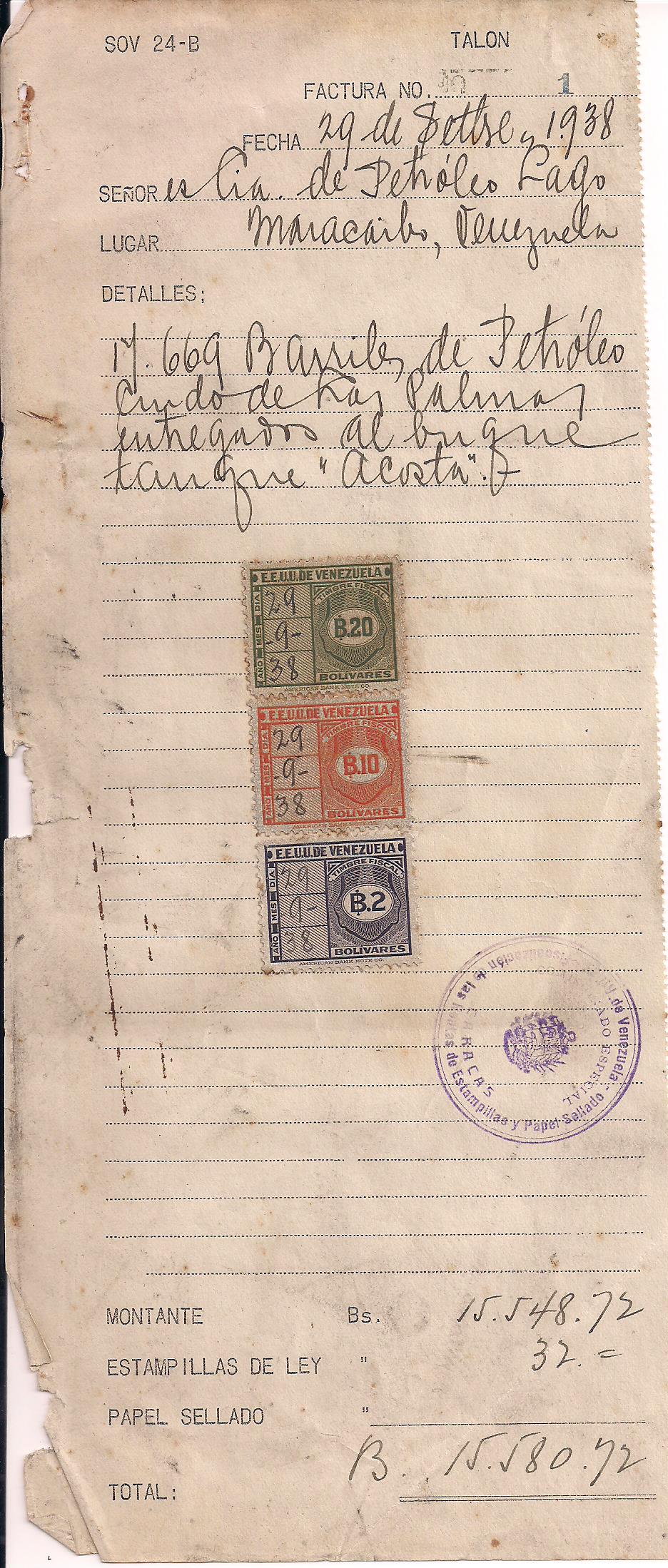 1938 Standard Oil receipt for payment of Bs. 32 for 17,669 barrils of oil, franked with 1 Bs. 20 revenue, 1 Bs. 10 revenue and 1 Bs. 2 revenue, interesting piece of oil industry history, high value revenues rarely seen, even scarcer on document $20 PHOTO