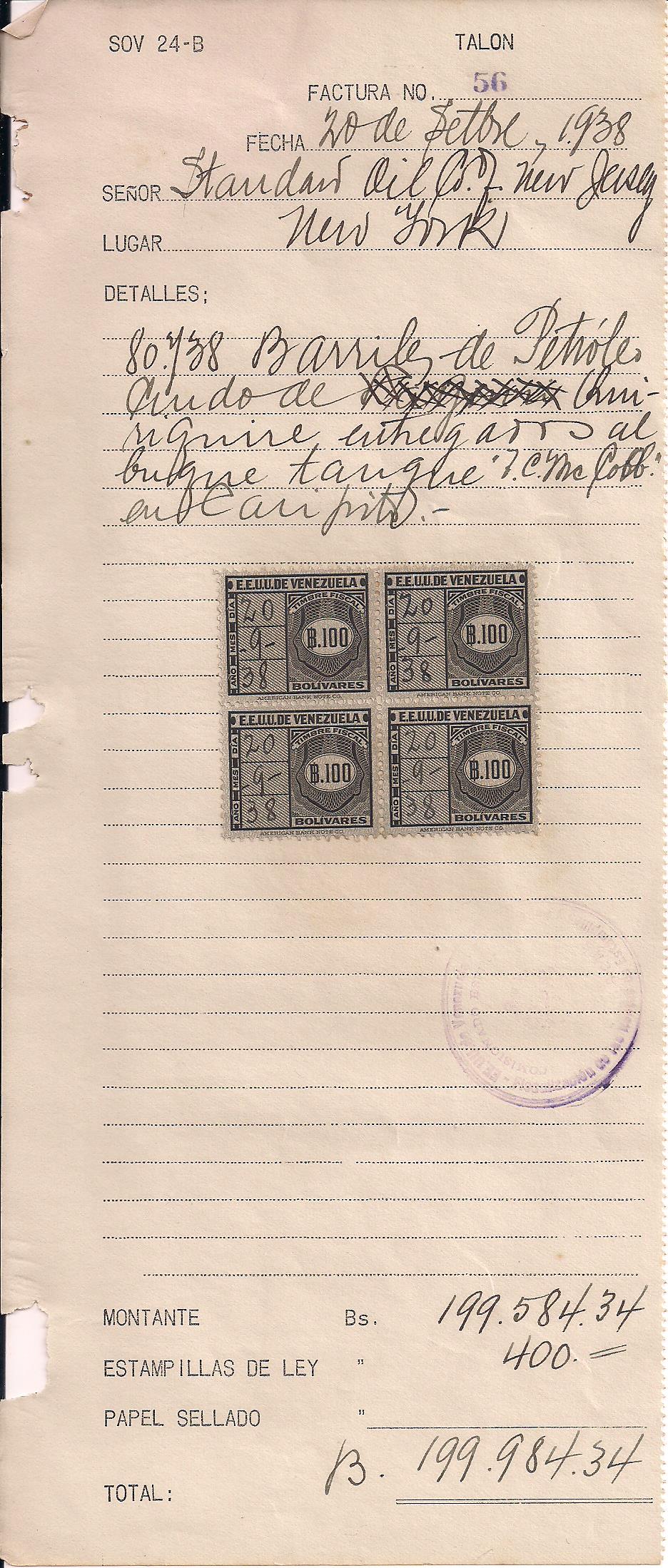1938 Standard Oil receipt for payment of Bs. 400 for 80,738 barrils of oil, franked with a block of 4 Bs. 100 revenues, interesting piece of oil industry history, high value revenues rarely seen, even scarcer on document $30 PHOTO