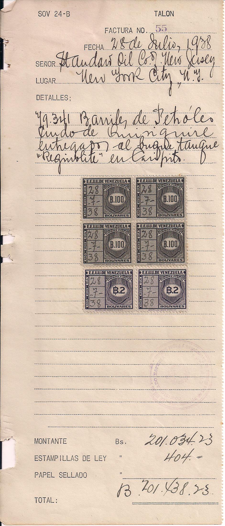 1938 Standard Oil receipt for payment of Bs. 404 for 49,341 barrils of oil, franked with 4 Bs. 100 revenues, and 2 Bs. 2 revenues, interesting piece of oil industry history, high value revenues rarely seen, even scarcer on document $30 PHOTO