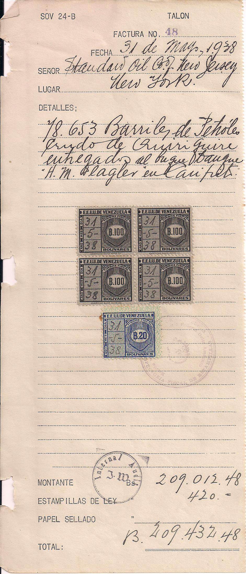 1938 Standard Oil receipt for payment of Bs. 420 for 78,653 barrils of oil, franked with 4 Bs. 100 revenues and 1 Bs. 20 revenue, interesting piece of oil industry history, high value revenues rarely seen, even scarcer on document $30 PHOTO
