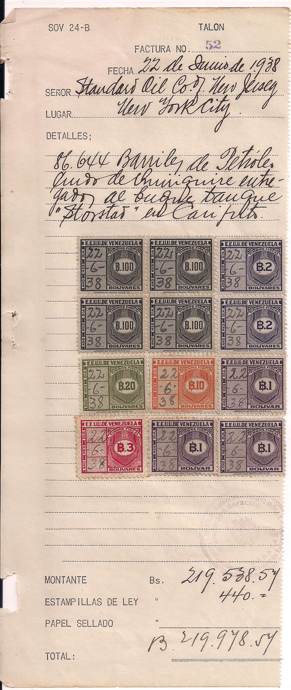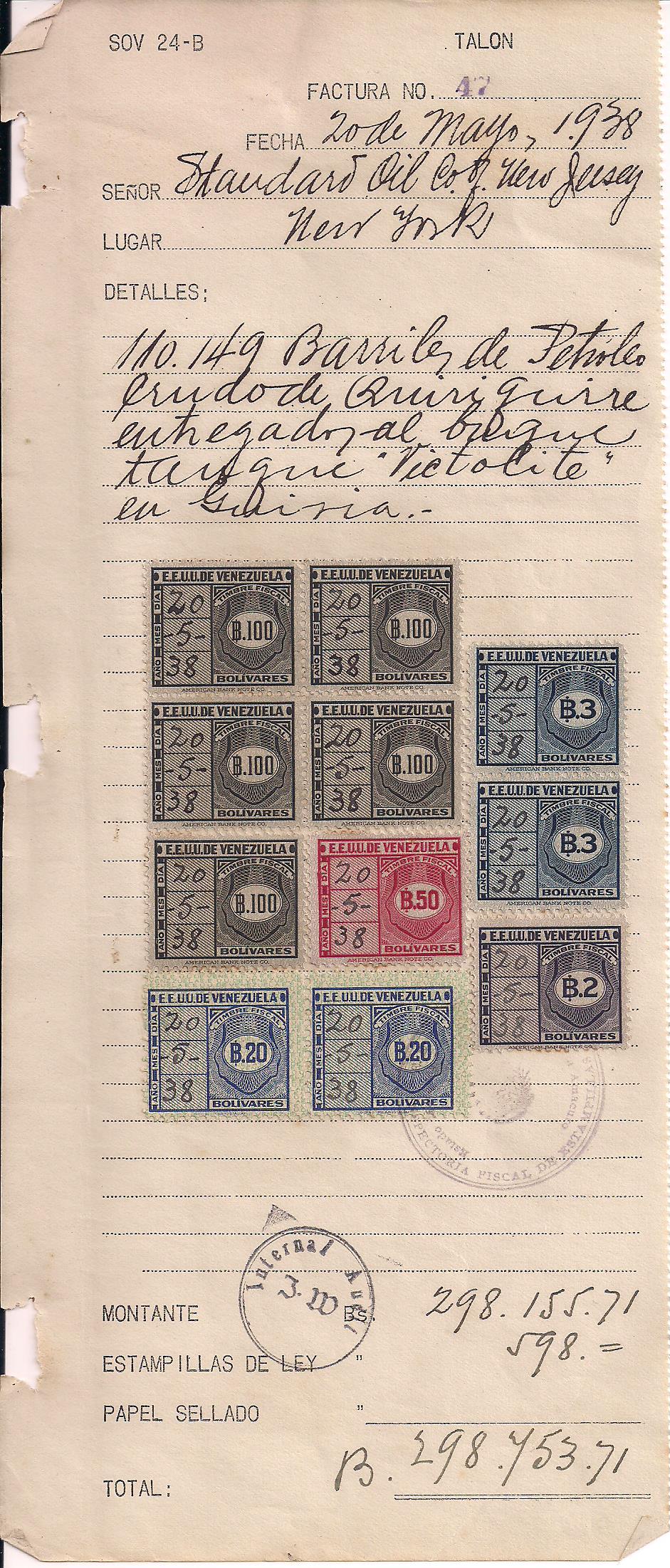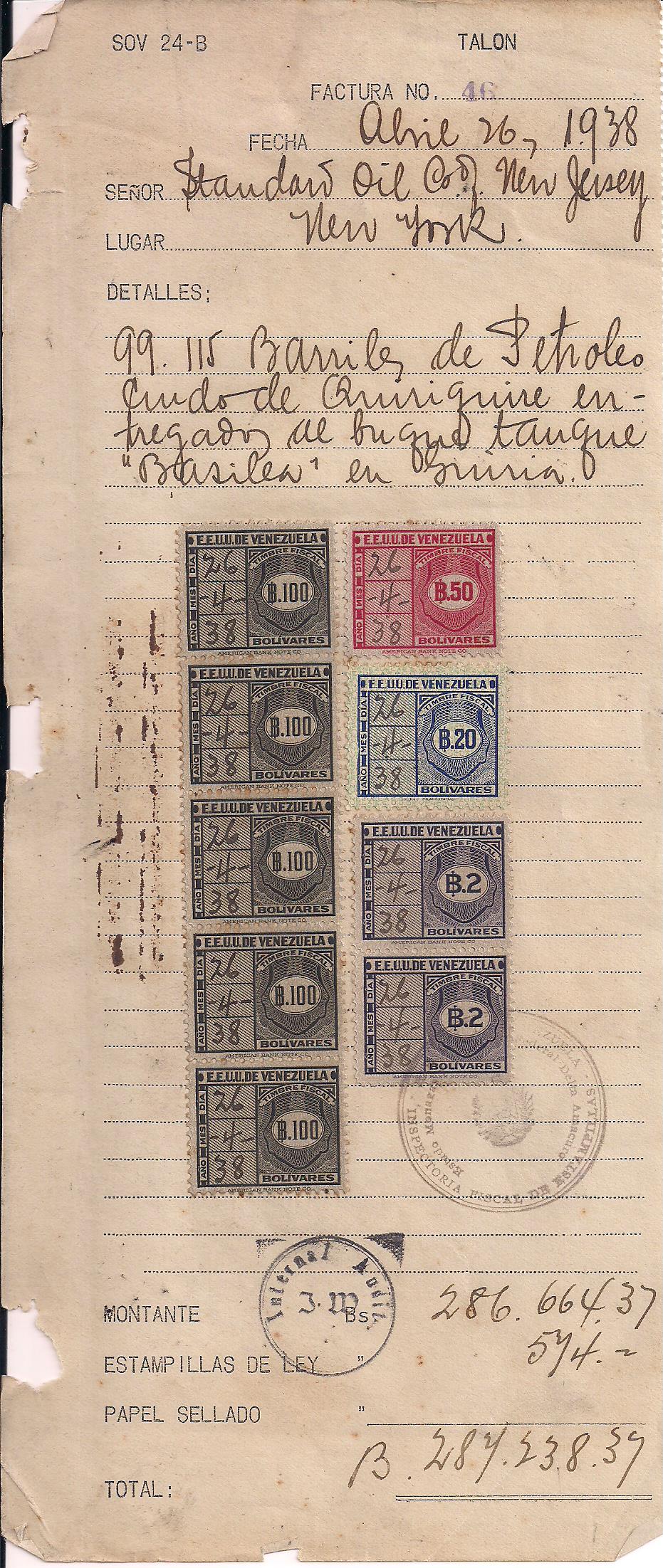 1938 Standard Oil receipt for payment of Bs. 574 for 99,115 barrils of oil, franked with 5 Bs. 100 revenues, 1 Bs. 50 revenue, 1 Bs. 20 revenue and 2 Bs. 2 revenues, interesting piece of oil industry history, high value revenues rarely seen, even scarcer on document $40 PHOTO