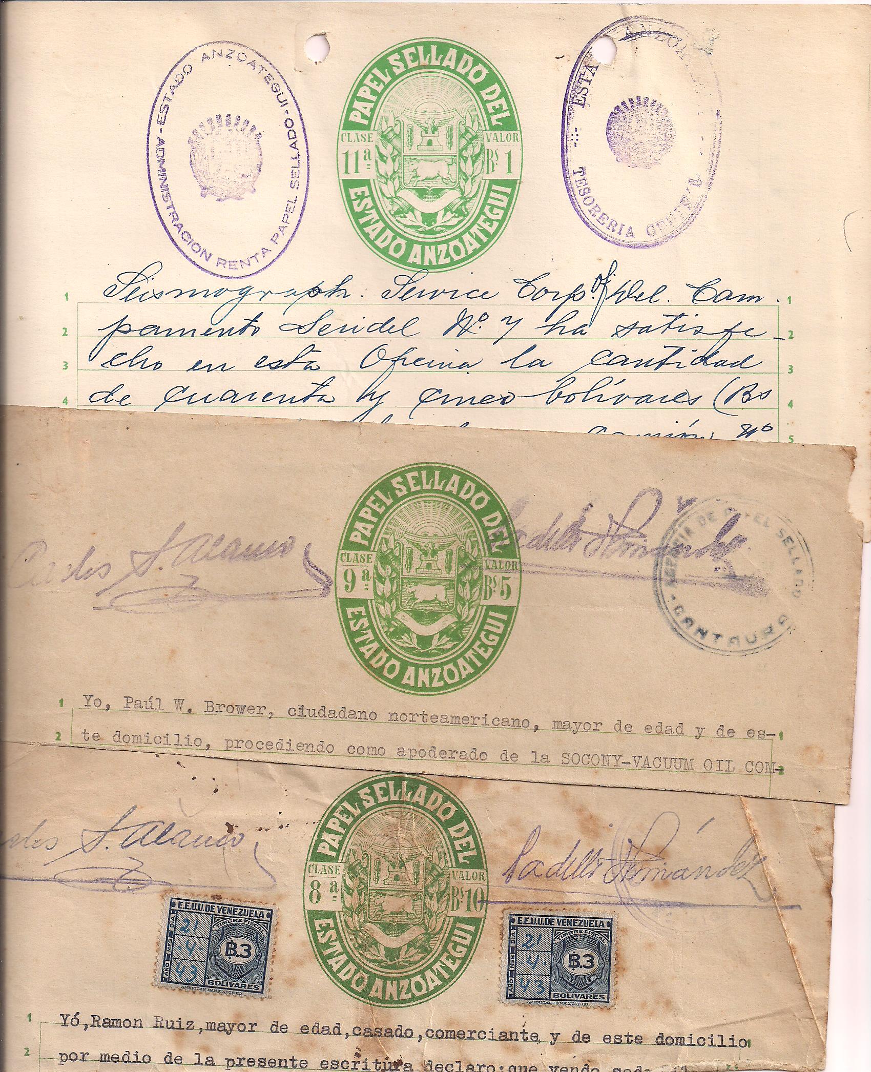 ANZOATEGUI STATE: Three different pieces of Papel Sellado approx 1943 (8th class--Bs. 10; 9th class Bs. 5 and 11th class Bs.1) $12 PHOTO