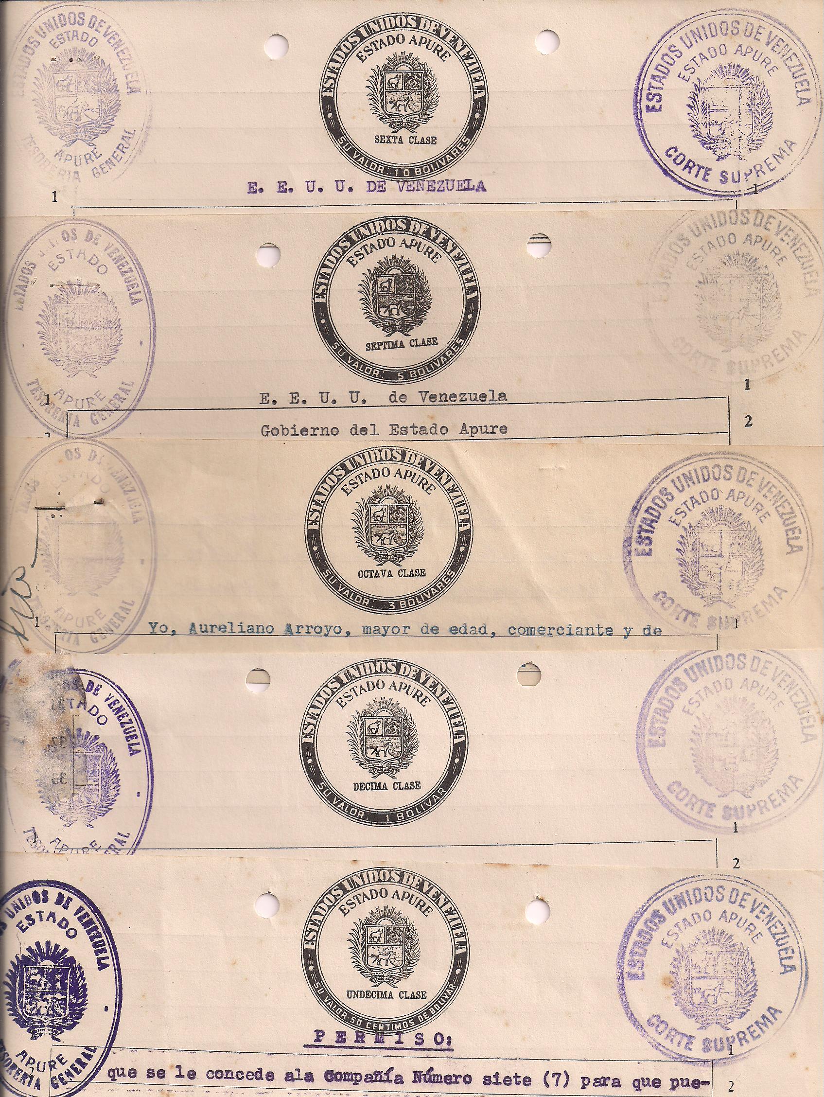 APURE STATE: Five different pieces of Papel Sellado (6th class--Bs. 10; 7th class--Bs. 5; 8th class-Bs. 3; 10th class--Bs. 1; and 11th class--Bs. .50). $20 PHOTO