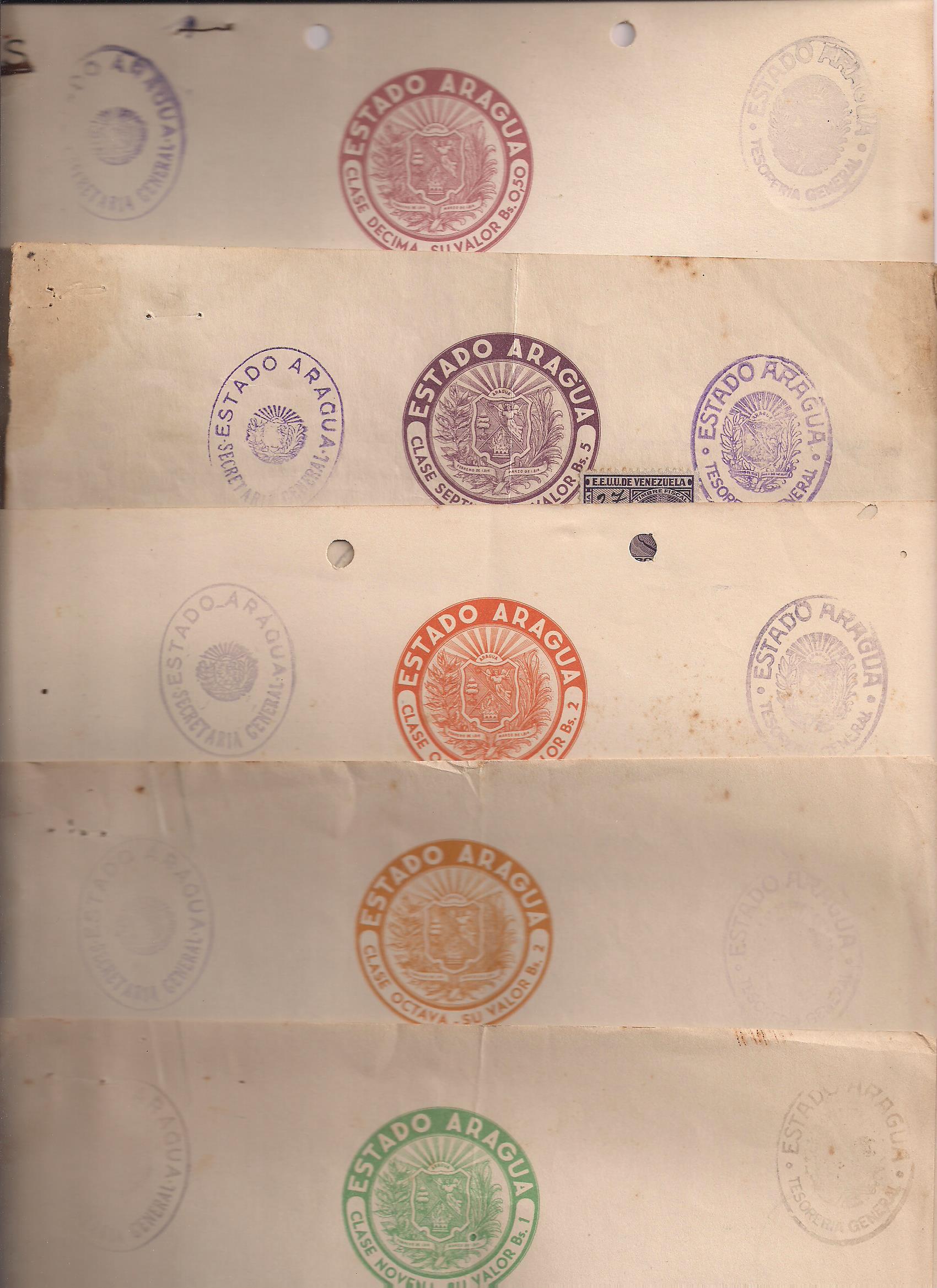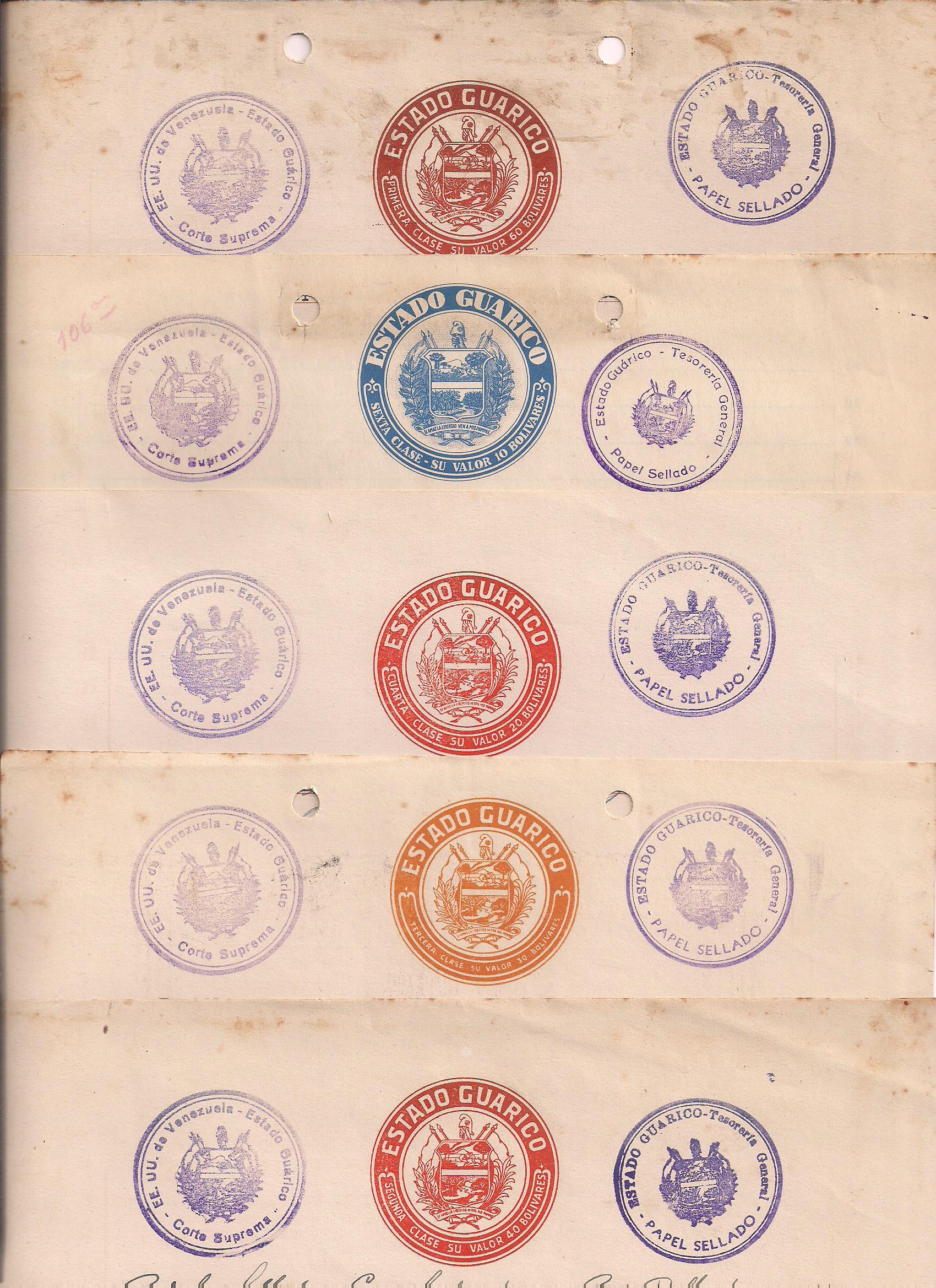 GUARICO STATE: Sixteen pieces of Papel Sellado (1st class--Bs. 60 (two colors); 2nd class--Bs. 40 (2 colors); 3rd class--Bs. 30; 4th class--Bs. 20; 5th class--Bs. 15; 6th class--Bs. 10; 7th class--Bs. 5 (three types); 8th class--Bs. 2 (two types), 9th class--Bs. 1; 10th class--Bs. .50 (two types) $75. PHOTO