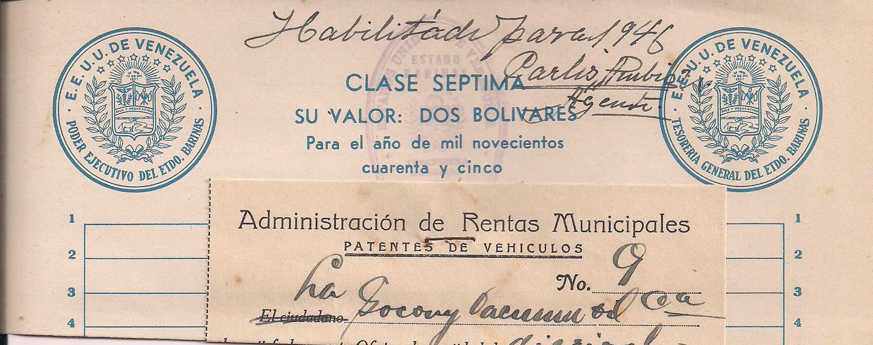 BARINAS STATE: One piece of Papel Sellado from 1945 used for automobile registration (7th class--Bs. 2) $5 PHOTO