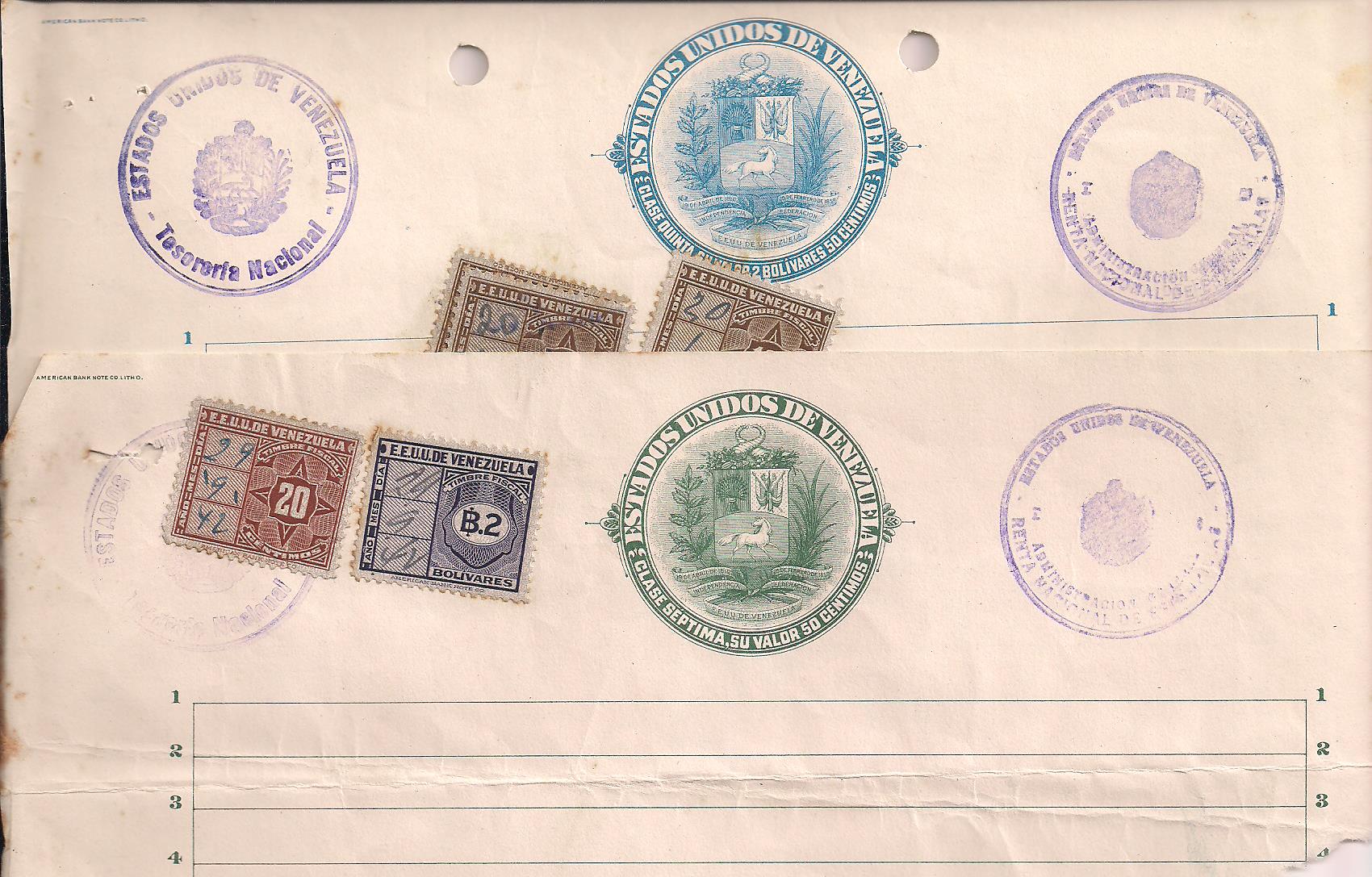 Papel sellado is used throughout Latin America for legal documents. To submit a legal document in a court (for virtually anything from a car registration to a divorce decree, the document must be completed by a notary public (in Latin America, notaries are prominent lawyers) on papel sellado. Papel sellado is a printed sheet of lined paper with a revenue stamp printed on the very top. Since these are legal documents, they do no often come available in the stamp marketplace. We recently acquired a box of mostly used, predominently Venezuelan papel sellado from several different states from the 1940s and 1950s. Most have been torn from their original documents. We have not trimmed these at all but prefer to leave them with as much content as possible so the pieces can be written up in your collections. If more than one of each is required, write us as quantities are available on some states and classes. Here is what we can offer: