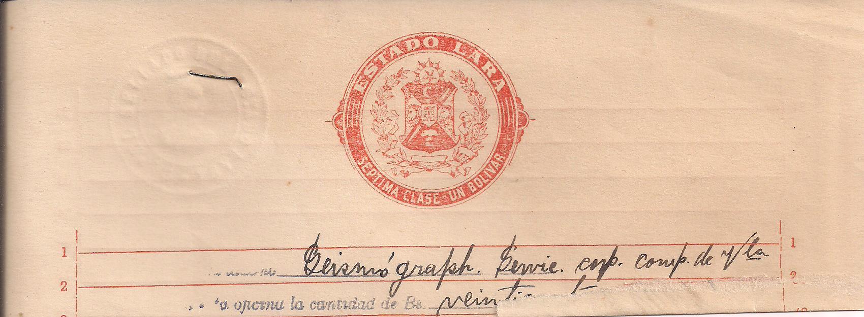 LARA STATE: 1 piece of Papel Sellado (7th class--Bs. 1) $5. PHOTO