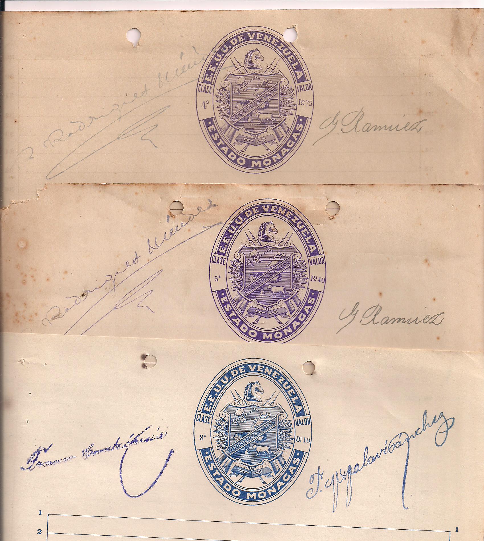 MONAGAS STATE: Eight pieces of Papel Sellado (4th class--Bs. 75; 5th class--Bs. 40; 8th class--Bs. 109th class--Bs. 5; 10th class--Bs. 2.50; 11th class Bs. 1; 12th class--Bs. .50; and 13th class--Bs. .25) $40 PHOTO