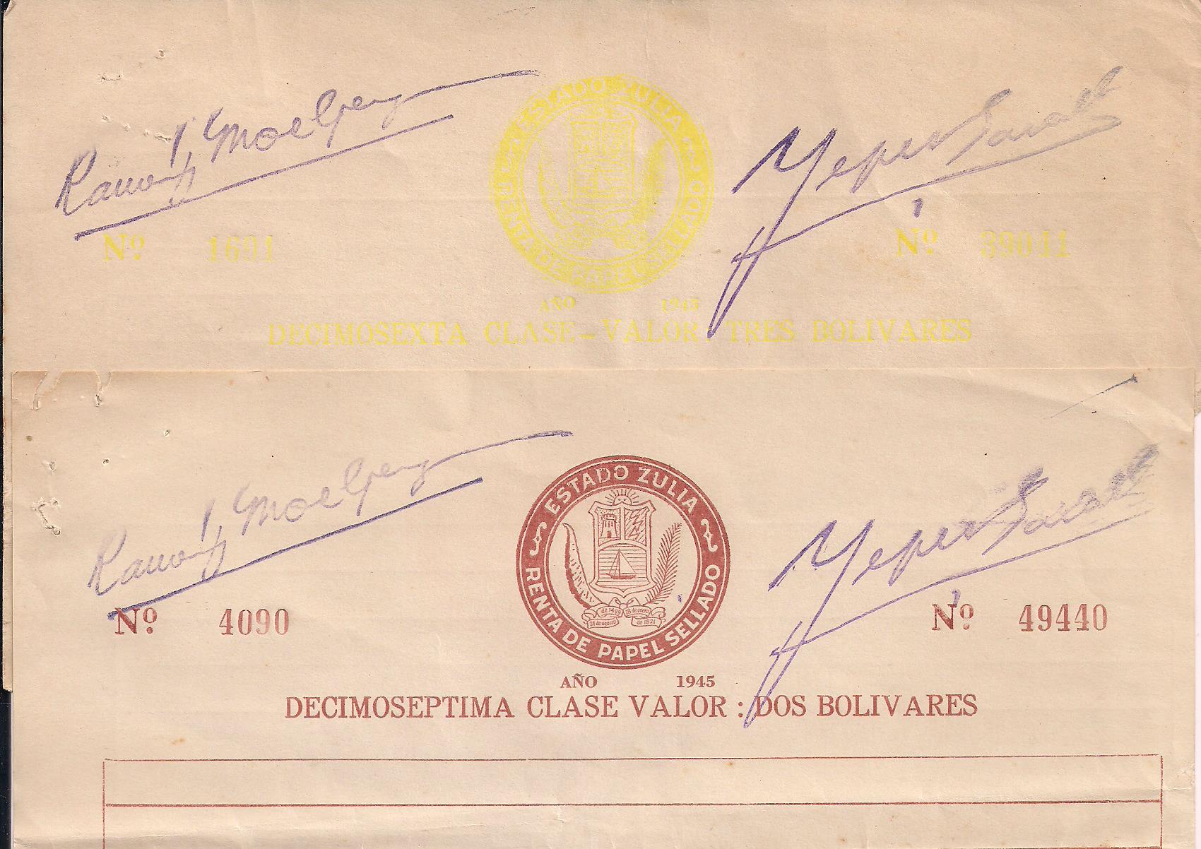 ZULIA STATE: Two pieces of Papel Sellado (16th class--Bs.3; 17th class Bs. 2) $8 PHOTO