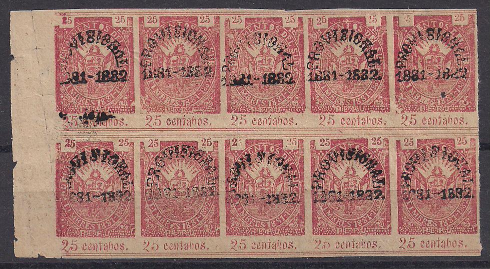 3N2 Block of ten with horiz crease affecting margin and edge of stamp 6. This block shows the poor printing of this sheet with overinking in position 1, missing 2 variety in position 5, "white O" in DEPARMENTOS (sic) in positions 1 and 4 and both the 2 1/2 and 3 mm print setting of the Provisional 1881-1882 overprint. A nice show piece. PHOTO $75