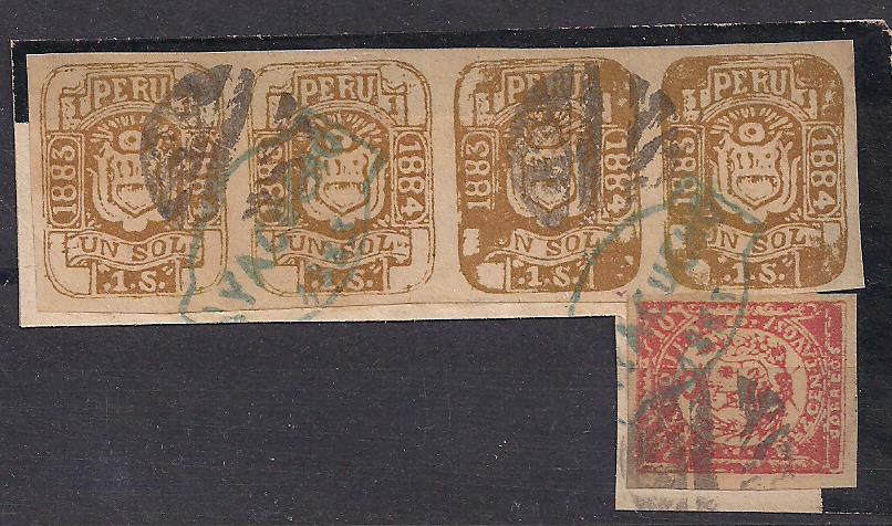 Arequipa Michel #V, 1 peso revenue used for postage. Used multiples of the one peso stamp used for postage are rare and this strip of 4 is unique--the largest multiple known. The strip is tied to a mourning piece with 3N7 and all are tied by an unrecorded AYACUCHO 1883 fancy cancel in blue and a fancy cork cancel. The total franking of 4.10 soles indicates the piece was taken from a very heavy packet. A real show piece. PHOTO $300